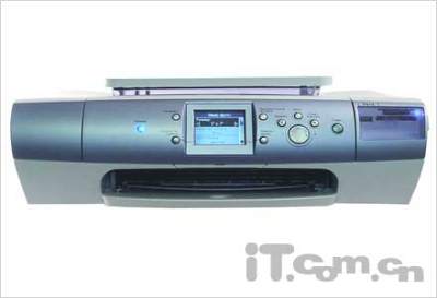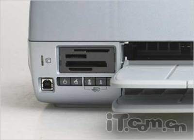 對于照片打印機來說,最重要就是它一般都設(shè)計內(nèi)置了數(shù)據(jù)讀卡單元,能夠在不連接計算機的情況下,可直接讀取數(shù)碼相機存儲卡中的照片數(shù)據(jù)并進行打印。可以從圖中看到,在Photosmart 7268前面板上提供的一組存儲卡插槽,這一組存儲卡插槽,能夠直接讀取CompactFlash、SmartMedia、Secure Digital、多媒體卡以及記憶棒等主流類型的存儲介質(zhì)。另外在插槽旁邊也提供了提供了打印10×15cm照片和打印照片拼頁的按鍵,接讀取數(shù)碼相機存儲卡中的照片數(shù)據(jù)并進行打印。